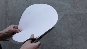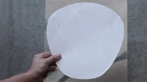 Step 1: draw bigger head shape and put marks of the taken eyeglasses’ frames measurement (left & right) – then cut around the paper as a base.