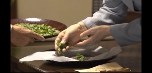 Empress Michiko selecting the undamaged cocoons with the team.