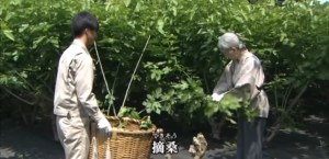 Empress Michiko with her private staff collecting the cocoon out of the weaved crossbar.